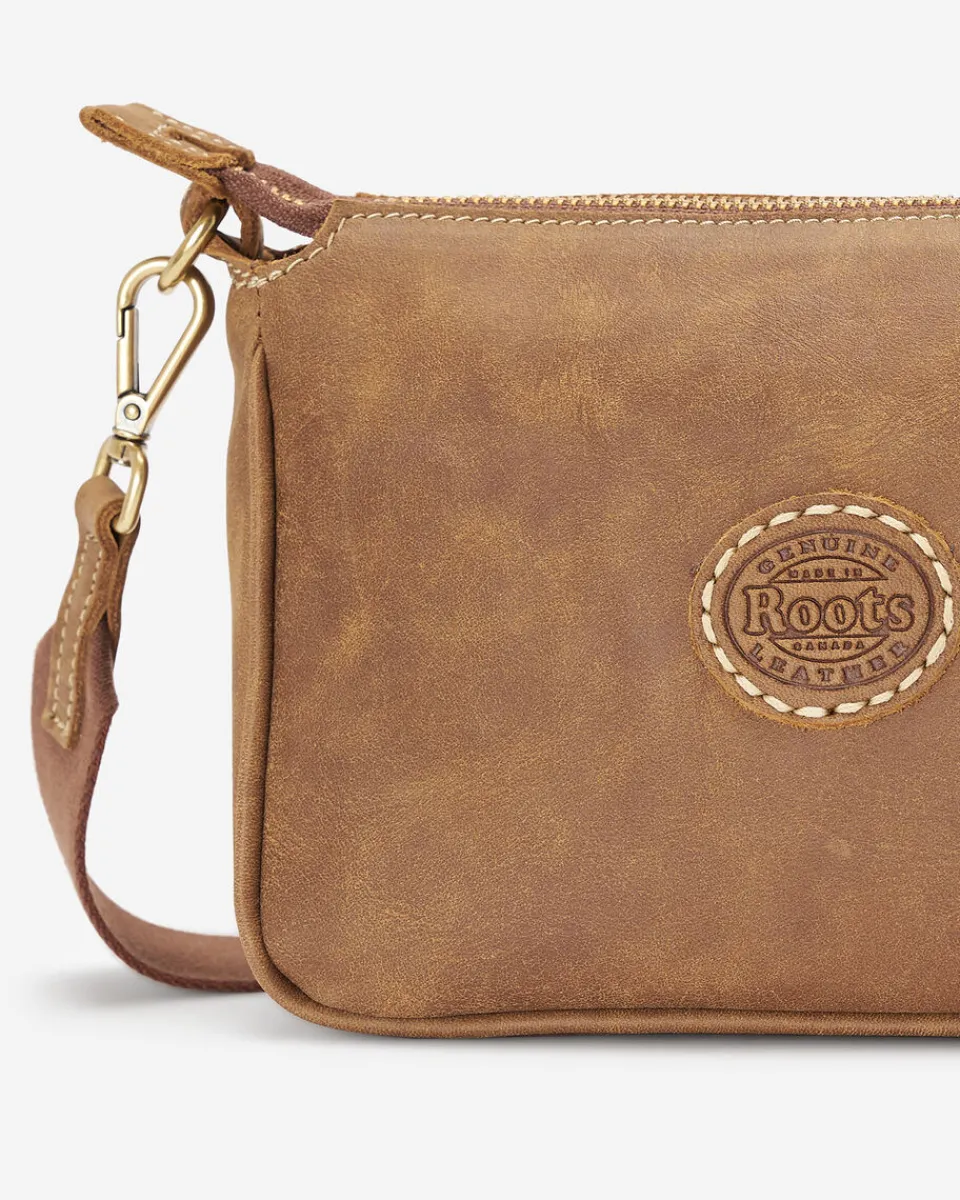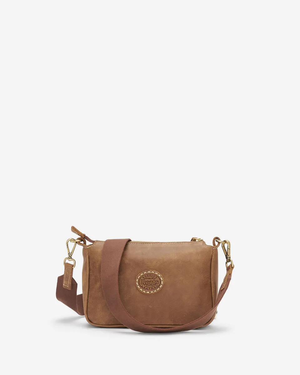 - Adjustable webbing shoulder strap with leather and dog snap detail