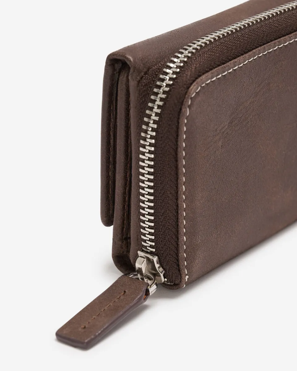 - Exterior zipper pocket with two credit card slots and middle divider